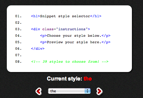 Snippet是一個(gè)很酷的jQuery語法高亮插件,基于SHJS腳本,你可以在SourceForge上找到源碼。